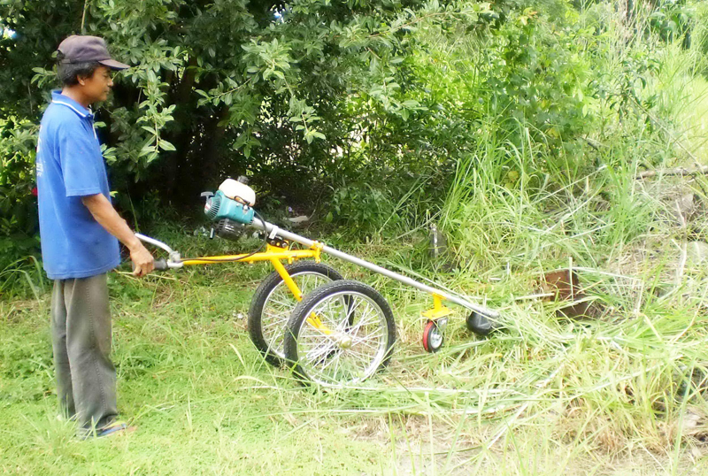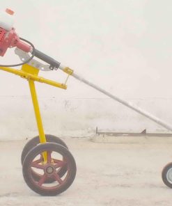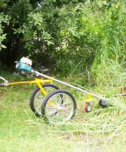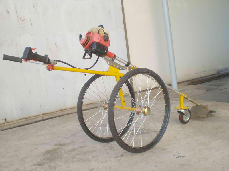 เป็นรถตัดหญ้าแบบใช้เครื่องตัดหญ้าสะพายไหล่ข้อแข็ง ติดตั้งบนรถเข็น 2 ล้อ ใช้งานได้คล่องตัวเหมือนกับสะพายไหล่ตัดหญ้า แต่ไม่ต้องสะพายเพียงเข็นรถปาดซ้ายปาดขวาเดินไปข้างหน้าเท่านั้น ใช้ตัดหญ้าที่เป็นเนินดิน ริมร่องสวน ใต้พุ่มต้นไม่ต่ำๆ มือจับเข็นสามารถปรับสูงต่ำได้ หัวมีดตัดหญ้าสามารถปรับองศาตามมุมเอียงของเนินดินได้