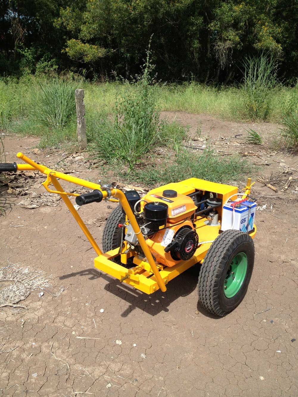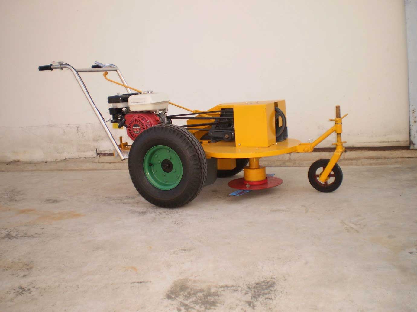 รถตัดหญ้า แบบเดินตาม ขับเคลื่อนด้วยล้อ 2 ข้างเป็นล้อรถยนต์ มีความแข็งแรงทนทานต่อแรงกระแทก ทนต่อหนามแหลมของวัชพืชไม่รั่วซึมง่ายมีเกียร์เดินหน้า